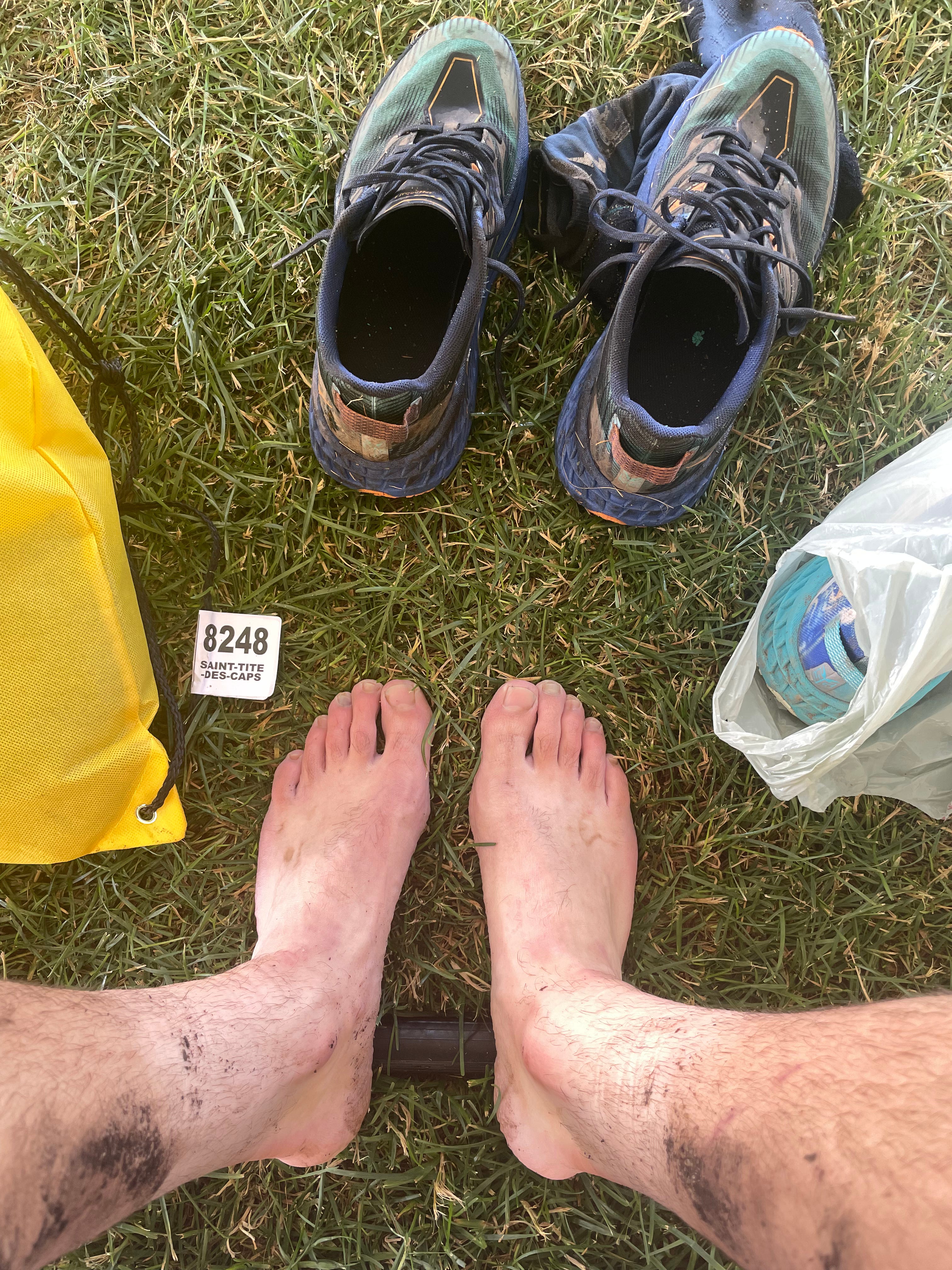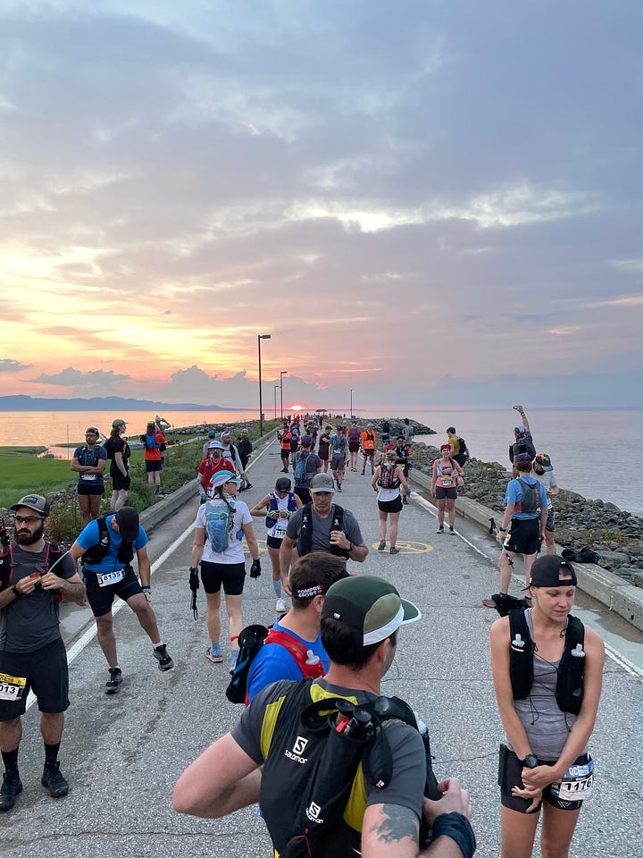 I made it all the way to the 57k aid station feeling surprisingly well. I was consciously moving quickly but not overexerting myself knowing there’s still a ways to go. It was a party at this aid station at Saint-Tite-des-Caps. I finally saw Alex there, we sat down for a minute together and since this was our drop bag location, I decided to quickly change my socks and shoes.